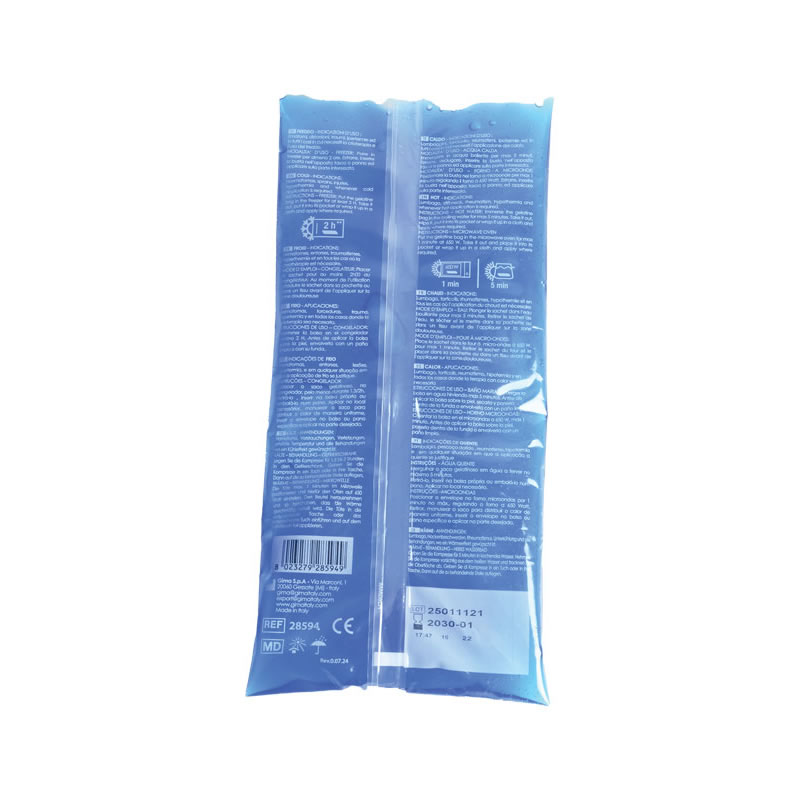 THERMY GEL CALDO-FREDDO 11×26 cm – confezione da 25 pezzi Istruzioni multilingue in: GB*, FR*, IT*, ES*, PT*, DE*, PL, NL, CZ, DK, SE, FI, EE, LT, LV, SK, SI, RO, HU, HR, GR, BG, Arabo. Thermy Gel caldo-freddo 11×26 cm è un dispositivo riutilizzabile per terapia del caldo e del freddo, indicato per il trattamento di traumi, infiammazioni e dolori muscolari. Grazie alla sua versatilità, può essere utilizzato sia riscaldato (in acqua calda o microonde) sia raffreddato (in freezer), adattandosi alle diverse esigenze terapeutiche. L’applicazione del freddo è particolarmente indicata in caso di contusioni, distorsioni, ematomi, traumi sportivi e stati infiammatori acuti. La terapia del caldo, invece, è utile per alleviare dolori muscolari, lombalgie, torcicollo, rigidità articolare e reumatismi, favorendo il rilassamento della muscolatura. Il formato 11×26 cm consente un’applicazione pratica su diverse aree del corpo. Il gel interno mantiene la temperatura per un periodo adeguato, garantendo un trattamento efficace e controllato. Confezione da 25 pezzi, ideale per studi medici, centri fisioterapici, ambulatori e utilizzo professionale. FAQ – Domande e Risposte Il gel è riutilizzabile? Come si utilizza per la terapia del caldo? Come si utilizza per la terapia del freddo? Per quali disturbi è indicato? Qual è la dimensione del prodotto?